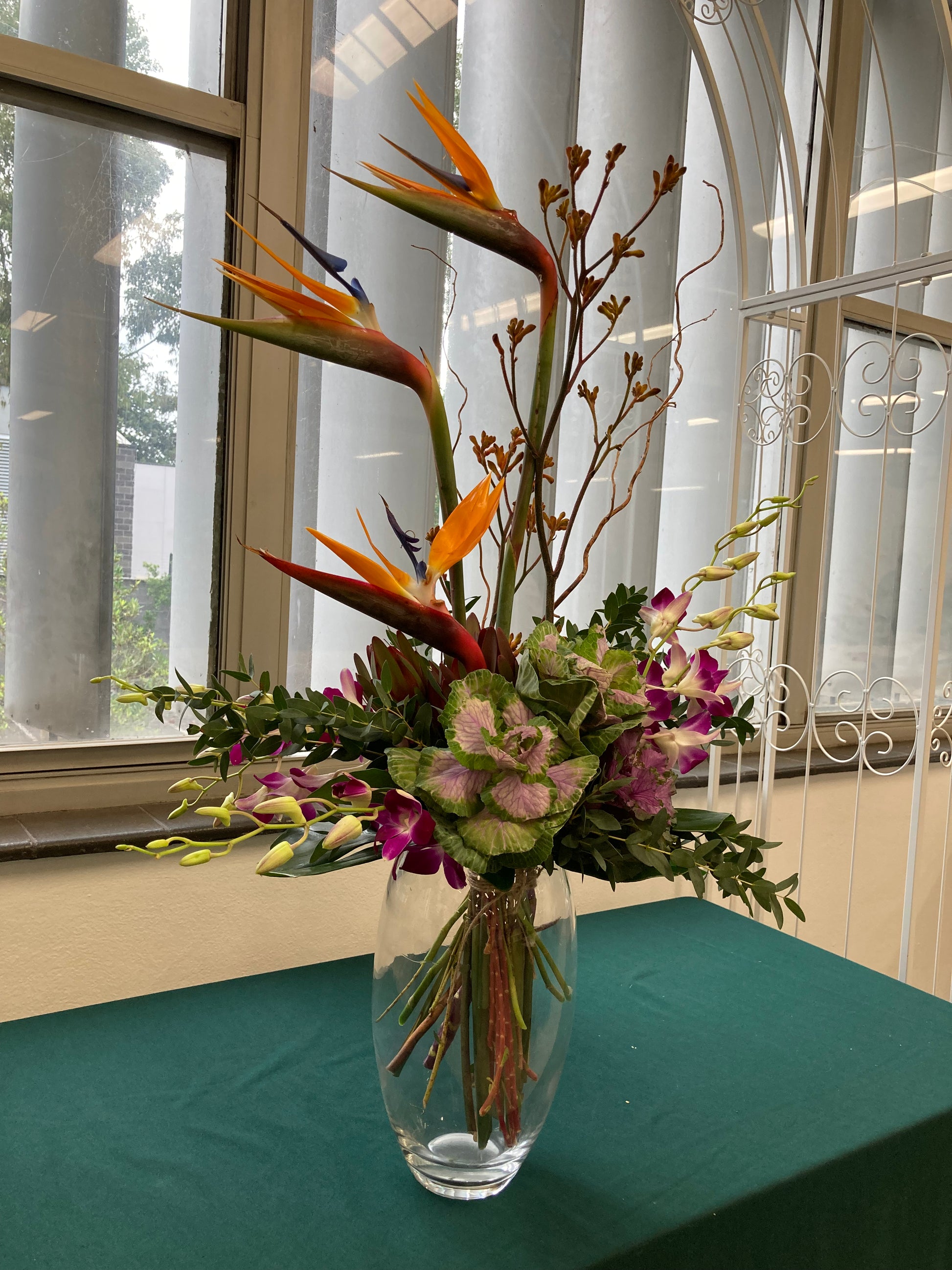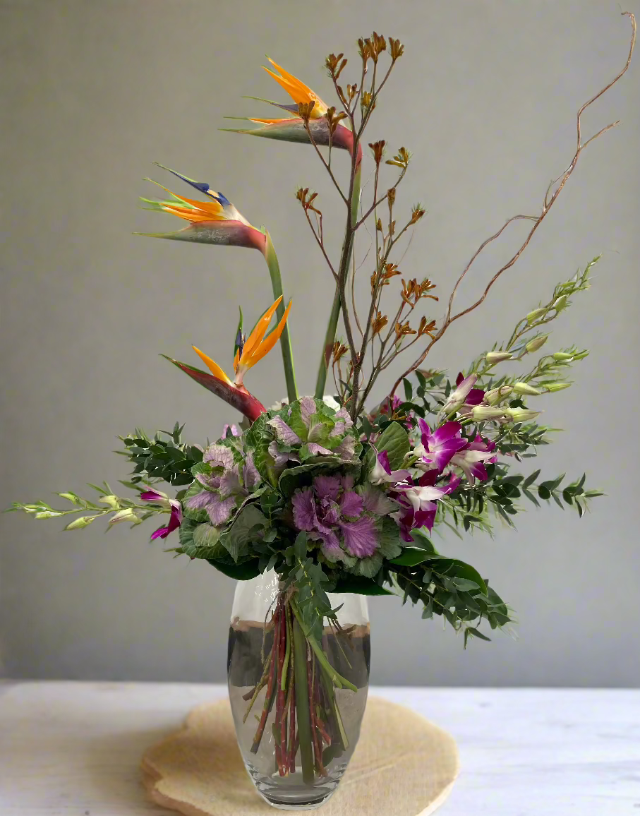 Elevate your office with our expertly crafted fresh flower arrangement. Featuring vibrant fresh flowers, ornamental Kale, Orchid, Natives, Strelitzia, and seasonal greenaries, our tall design arrangement is both eye-catching and long-lasting. Enjoy the aesthetic benefits of real flowers while creating a professional and inviting workspace.
